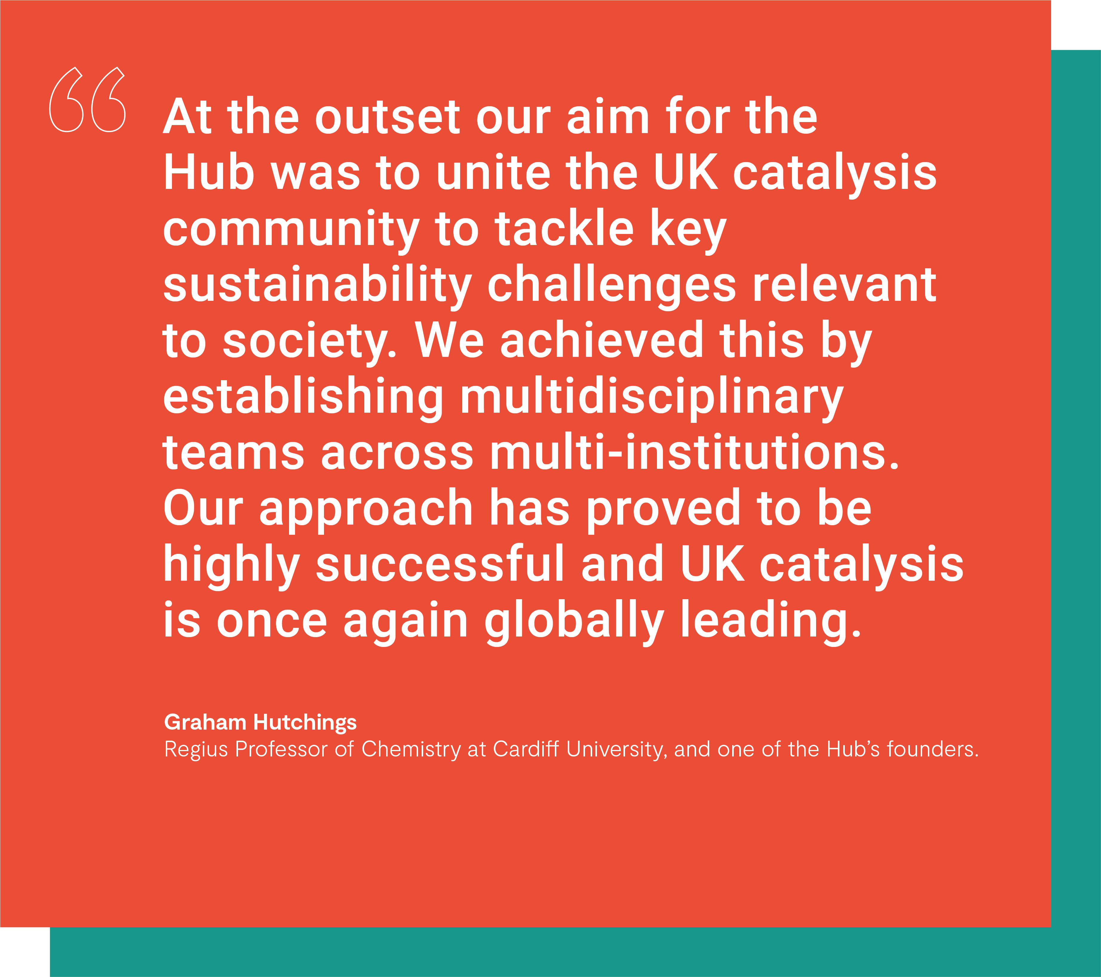 The UK Catalysis Hub, which has been supported by EPSRC since 2013, has built a thriving community of catalysis researchers in academia and industry. The Hub provides an important national capability, supporting a key UK industry sector. Research outputs from the Hub are leading to new, sustainable chemicals and manufacturing processes that will be vital if we are to tackle the climate crisis and minimise the environmental impact of the chemical and manufacturing industries globally.