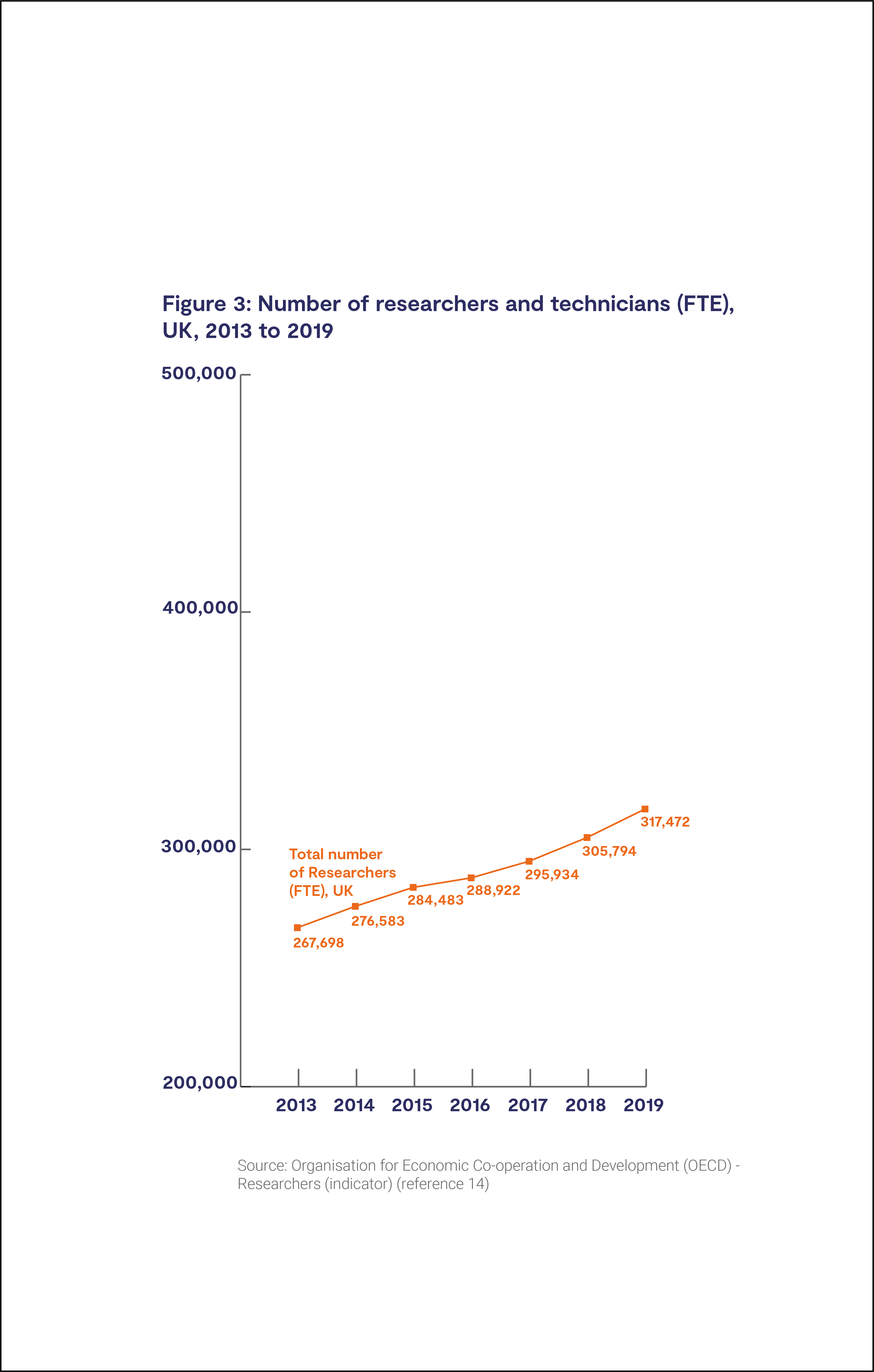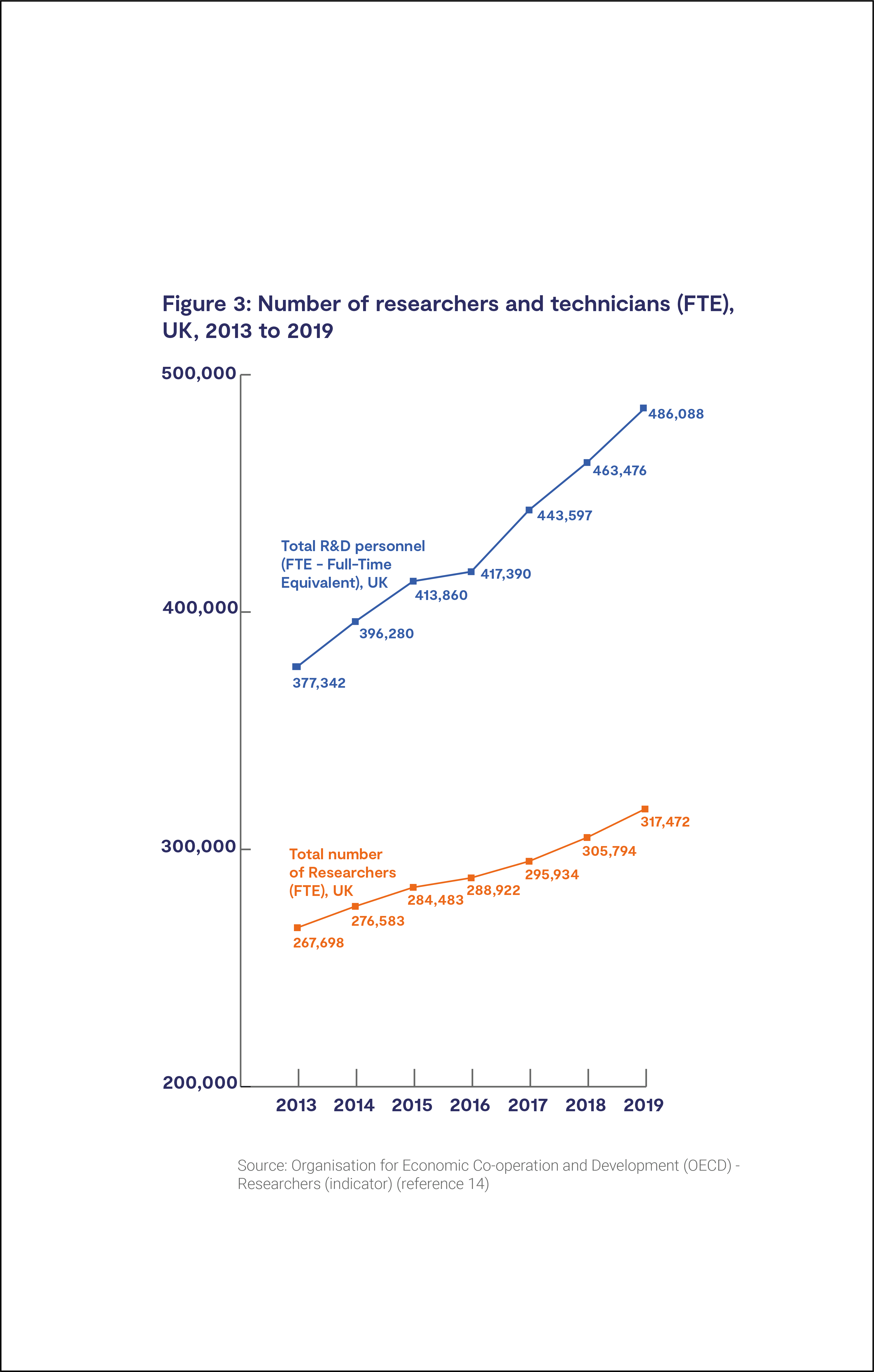 Figure 3: The graph below shows the increase in researcher and technician populations (FTE) over the last ten years
