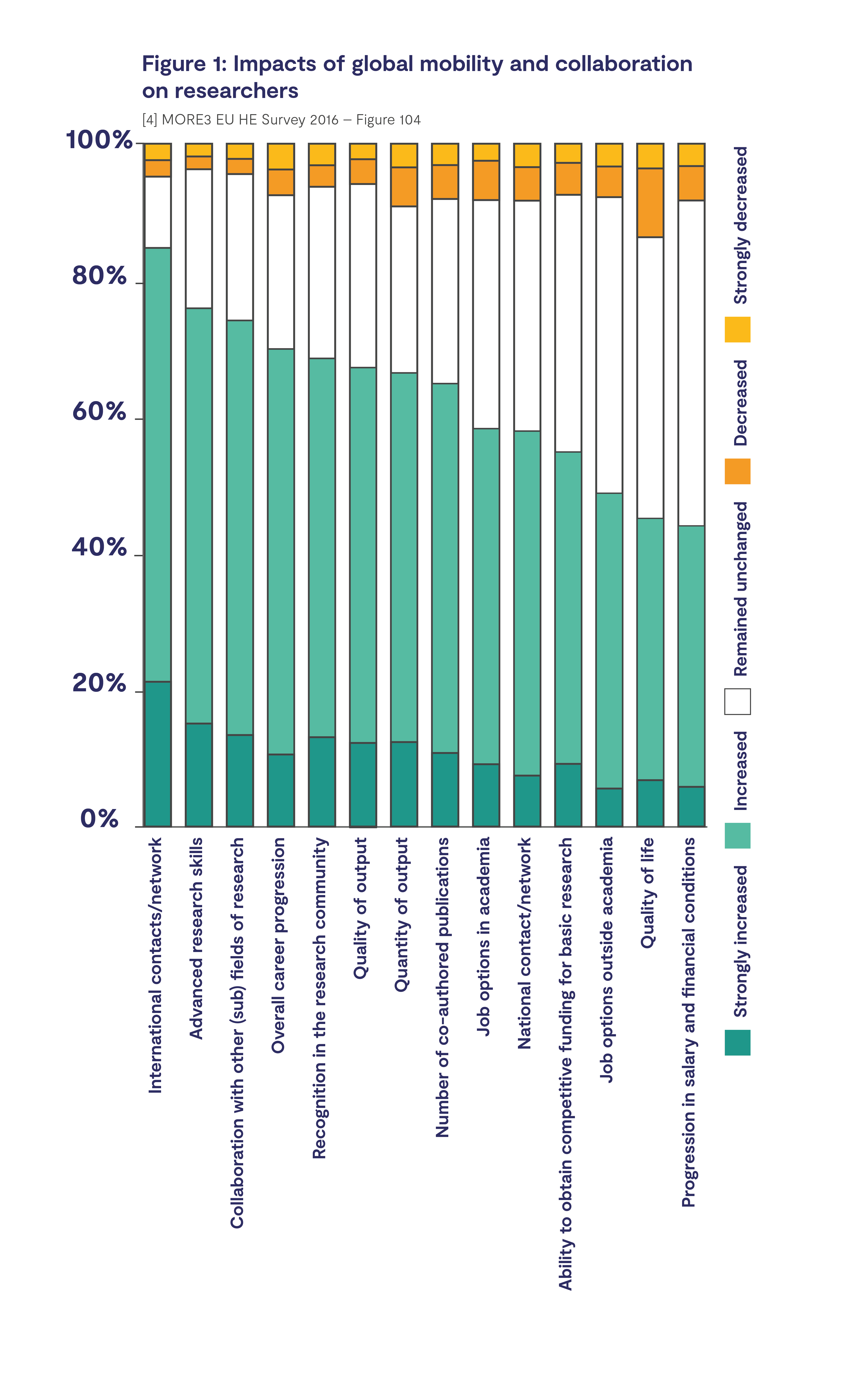 A large-scale study of EU researchers found that career progression was the most commonly cited reason for international mobility among PhD students and researchers in all post-PhD career stages. Among non-EU researchers who had relocated to the UK, career progression was the most common driver (15). A survey of international academics from 17 countries also found that higher salaries played an important part in attracting highly qualified academics from abroad (16). It should be noted that a MORE3 study found that 68. 2% of researchers surveyed agreed that career progression is sufficiently merit-based in the UK and 74. 9% of researchers suggested that career paths are transparent (15). The UK generally scores well in terms of career progression in comparison to other European countries.