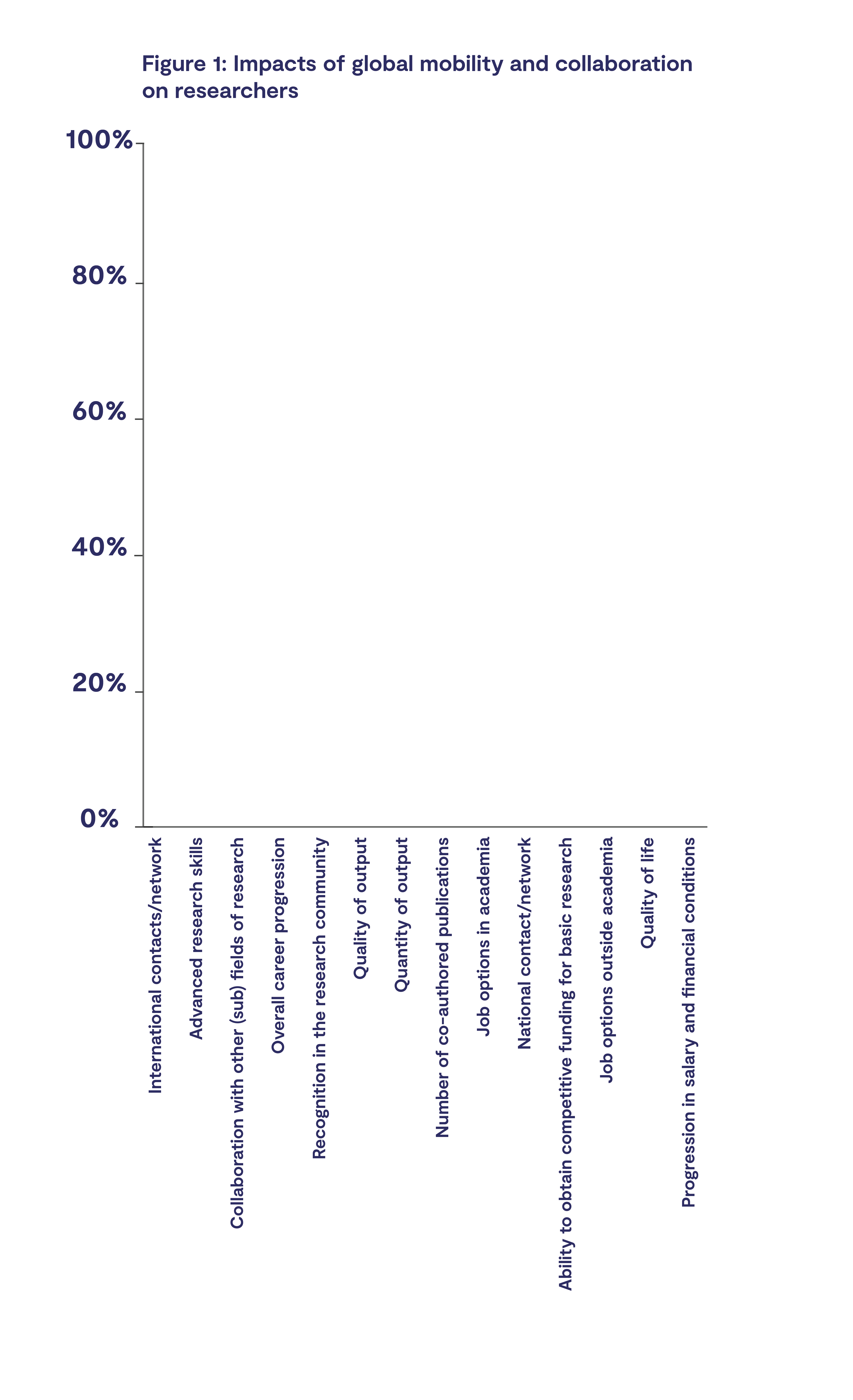 The impact of global mobility and collaboration on a researcher can be significant. Over 80% of survey respondents said their international contacts/network strongly increased or increased as a result of their entire mobility experience. Over 70% of survey respondents said their advanced research skills increased or strongly increased as a result of their entire mobility experience. Similarly, approximately 70% of survey respondents said collaboration with other (sub)fields of research either strongly increased or increased as a result of their entire mobility experience.