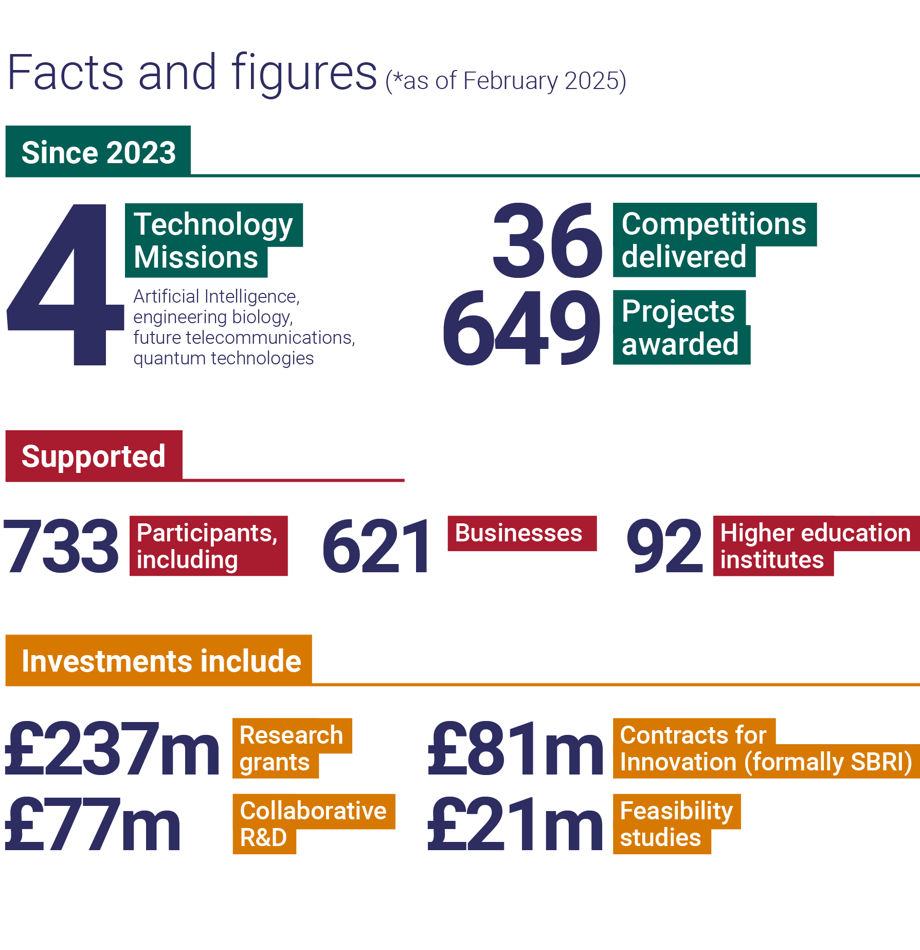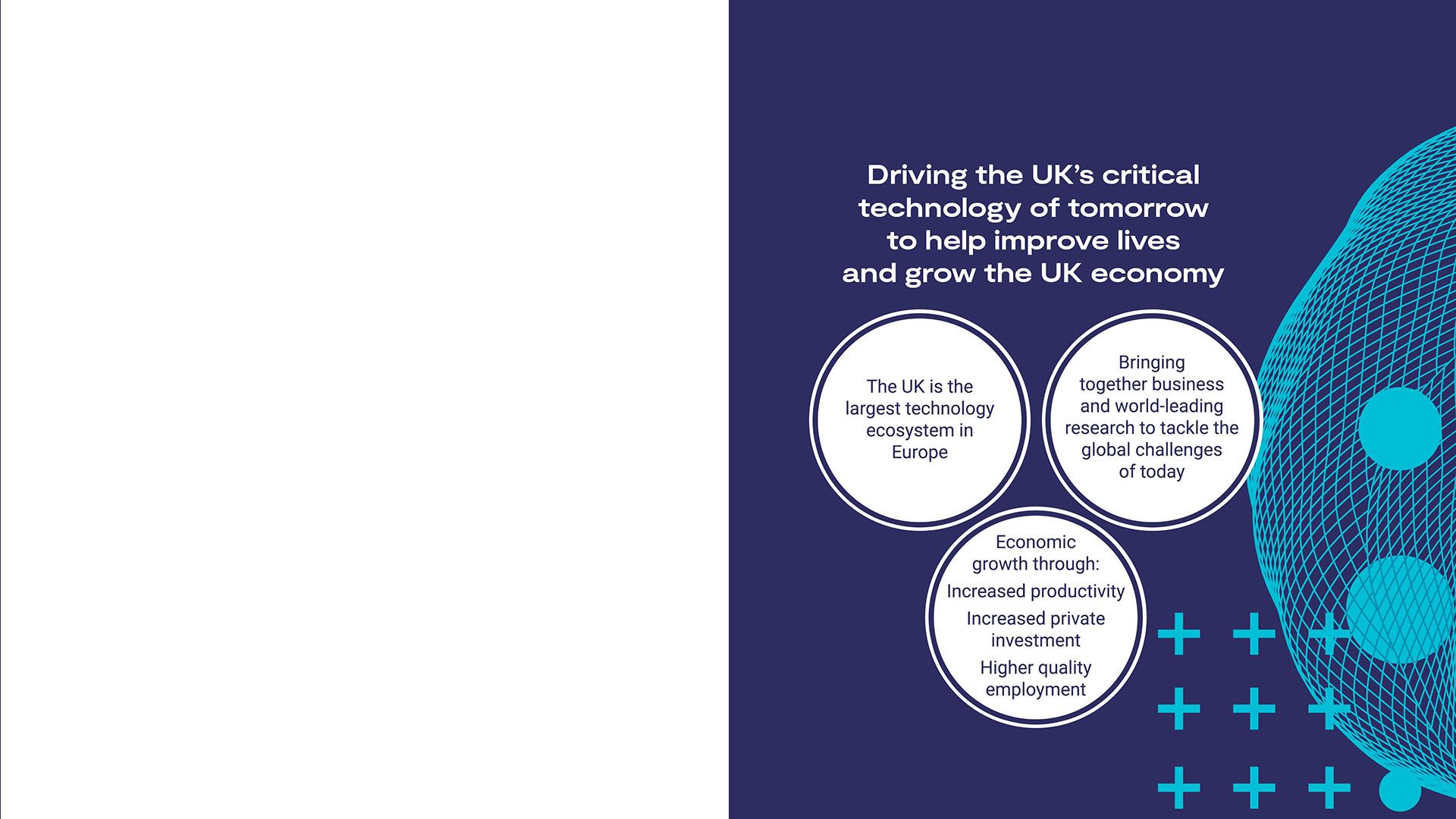 In partnership with government departments, the research base and businesses, we are driving the development and commercialisation of the UK’s critical technologies of tomorrow to help improve lives and grow the UK economy.