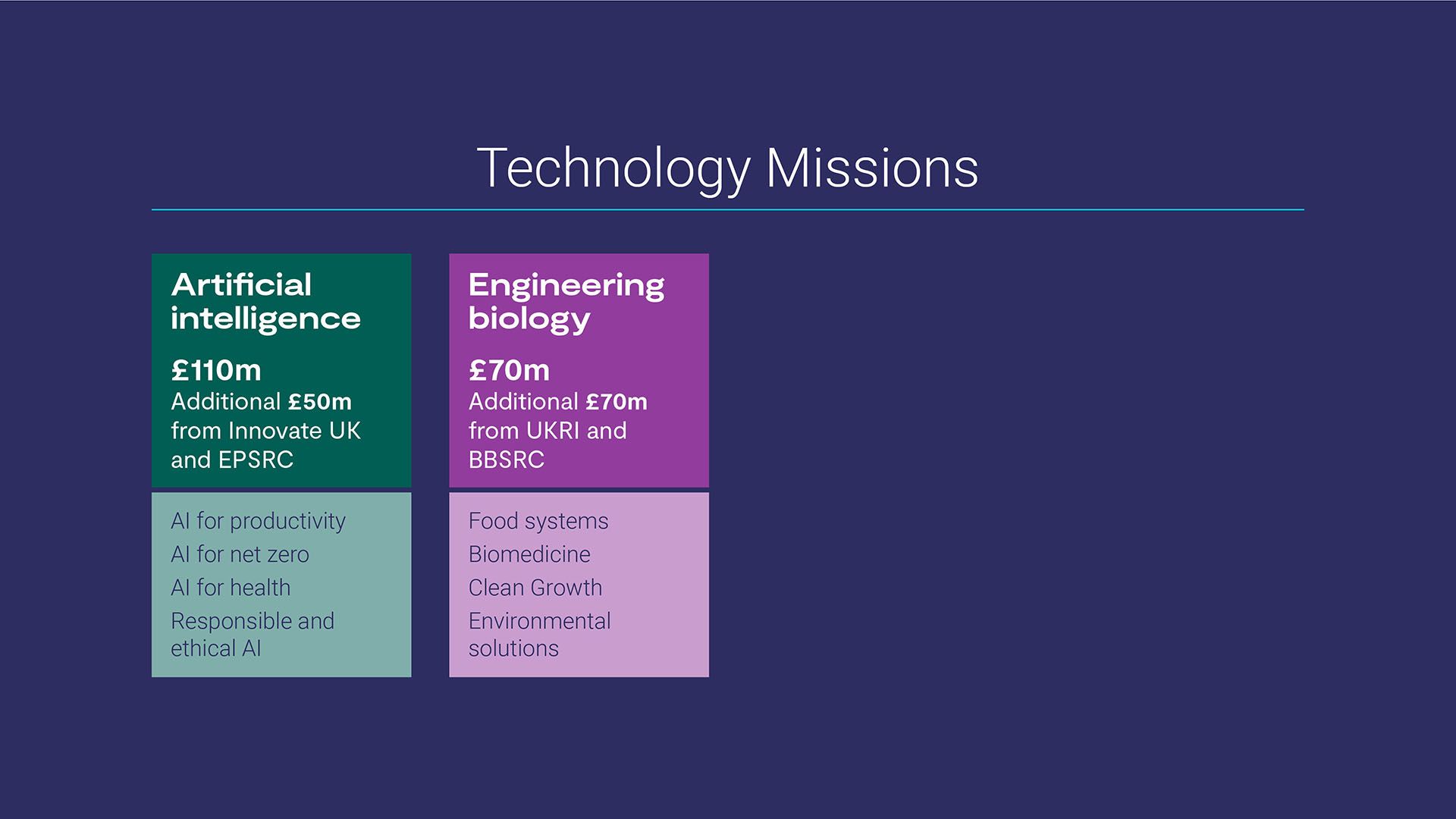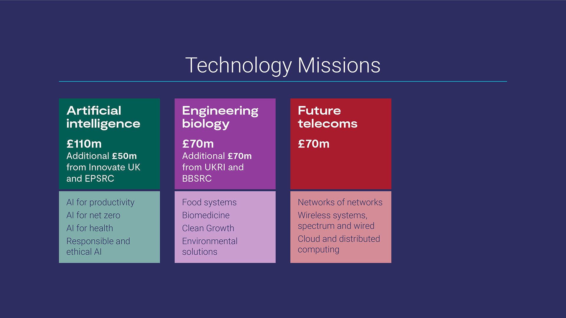 investment by UKRI in Technology Missions to support artificial intelligence, engineering biology, future telecommunications and quantum technologies