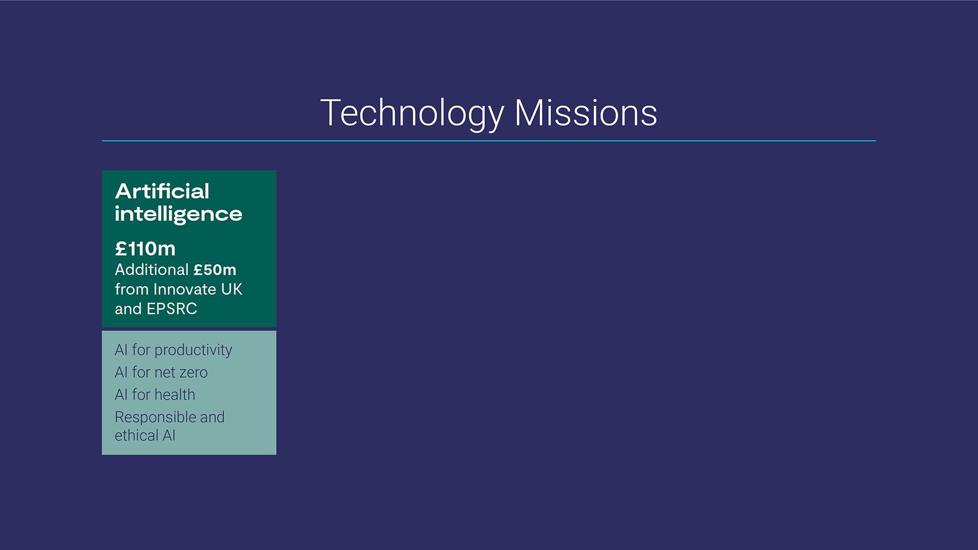 We are investing £110 million in AI Technology Missions to develop new approaches to responsible and trustworthy AI, increase adoption of AI in high-growth industries to boost productivity, support AI in healthcare, and to reduce greenhouse emissions contributing to a net zero economy.